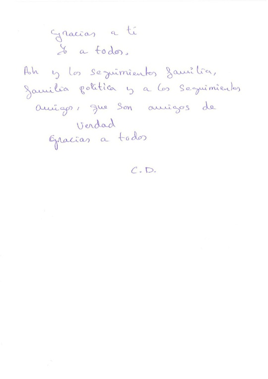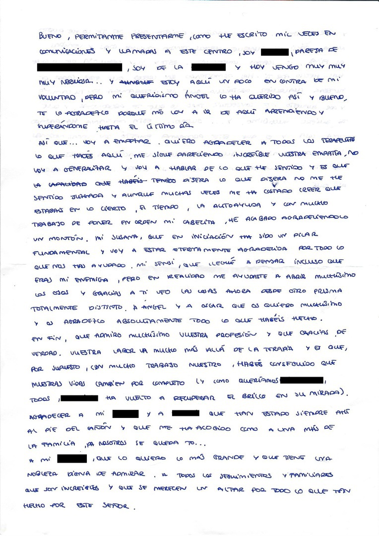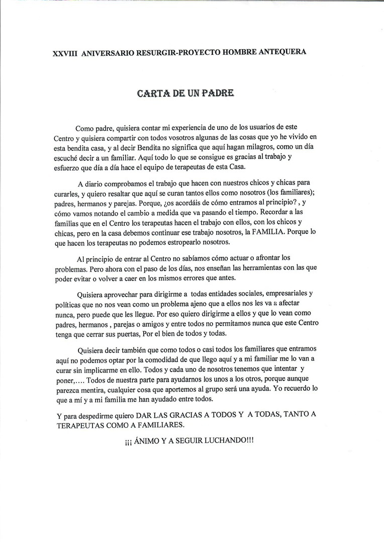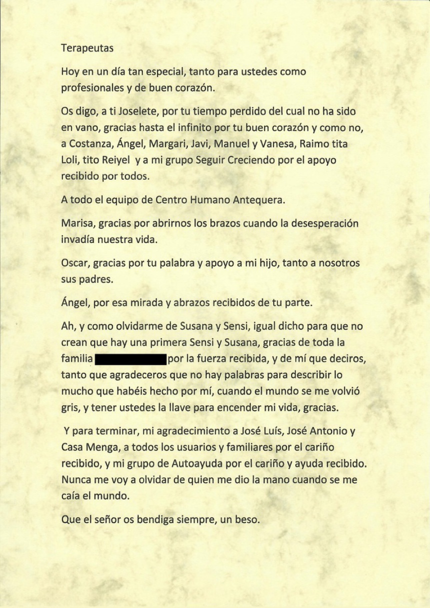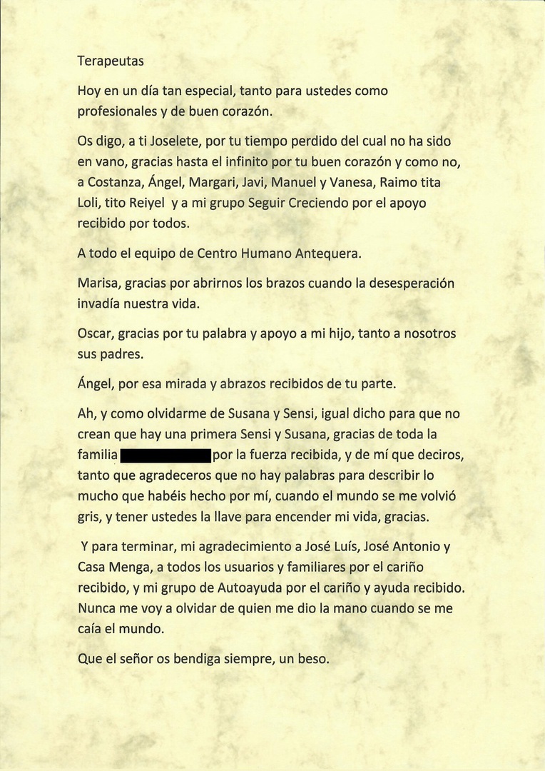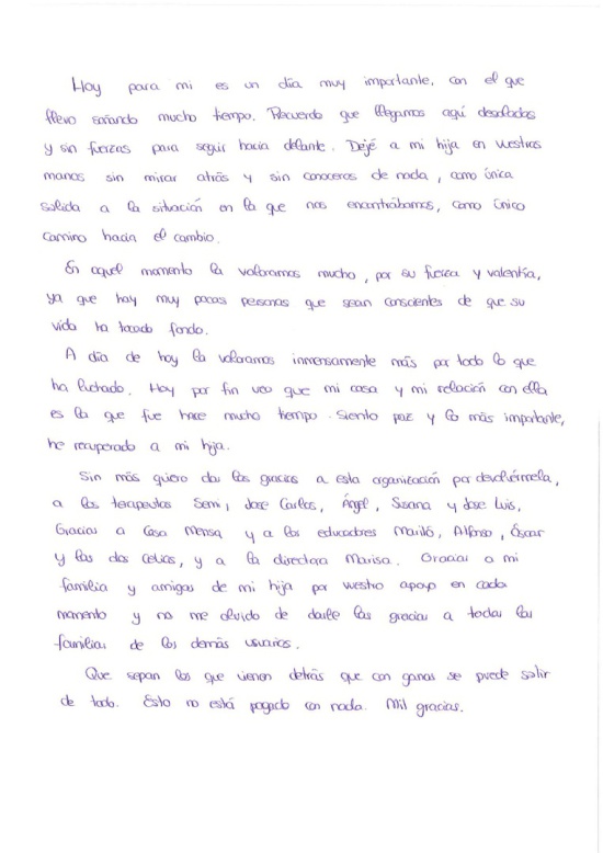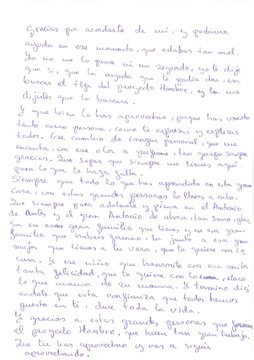 Pues quiero agradecer a Proyecto Hombre lo que han hecho por mí, por ayudarme a reconducir mi vida, por unirme más a mi familia y también, que si no, no hubiera conocido a una bella persona que por suerte es m pareja, al igual que a mis padres. A ella le debo muchísimo por lo siguiente: por haber estado ahí cuando lo he necesitado, por darme el apoyo que he necesitado para seguir hacia delante por sorprenderme, por pelearme o echarme una charla y por muchas cosas más que me faltaría tiempo para contar.