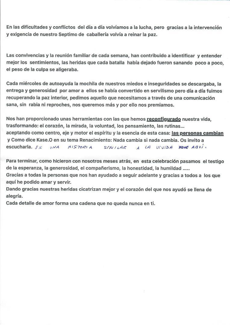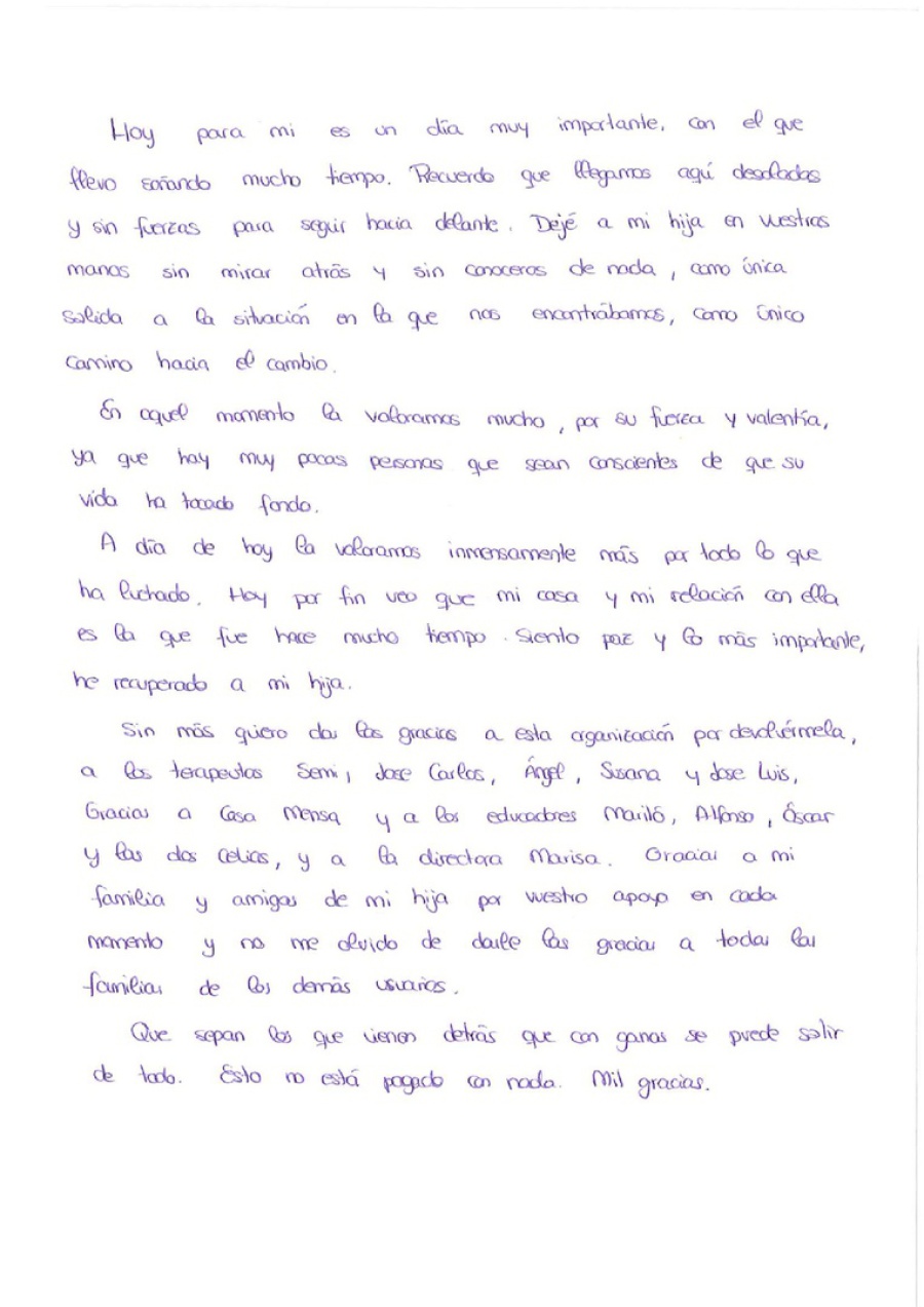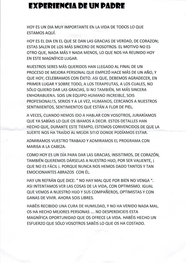 Bueno hoy es un día muy especial para mí porque he conseguido alcanzar la meta que tenía de poder acabar el programa que era una cosa que tenía muchas ganas de alcanzar y no voy a hablar del proceso porque todos los que estamos aquí sabemos lo que es estar en el programa, lo único que voy a decir es todo lo que he conseguido aquí, que es poder tener una mejor relación con mi familia que es lo más grande que tengo y que sin ellos no sería nada, y al estar aquí he podido compartir muchas cosas, tanto como risas y cosas bonitas y tristeza y llantos, y gracias a todas esas cosas estamos tal y como estamos, y aunque me dijeron que no lo hiciera, le voy a dar las gracias a todos los terapeutas que han estado hoy para ayudarme y a mis compañeros del programa que también han hecho mucho para que pueda superar el programa.