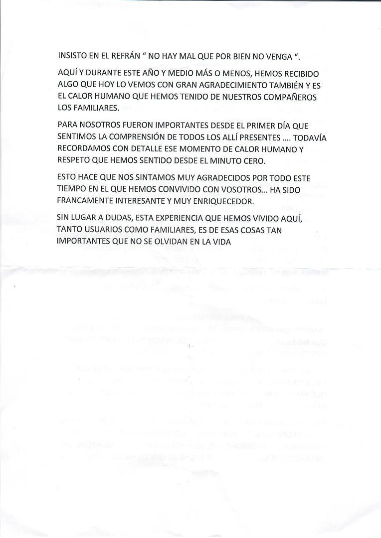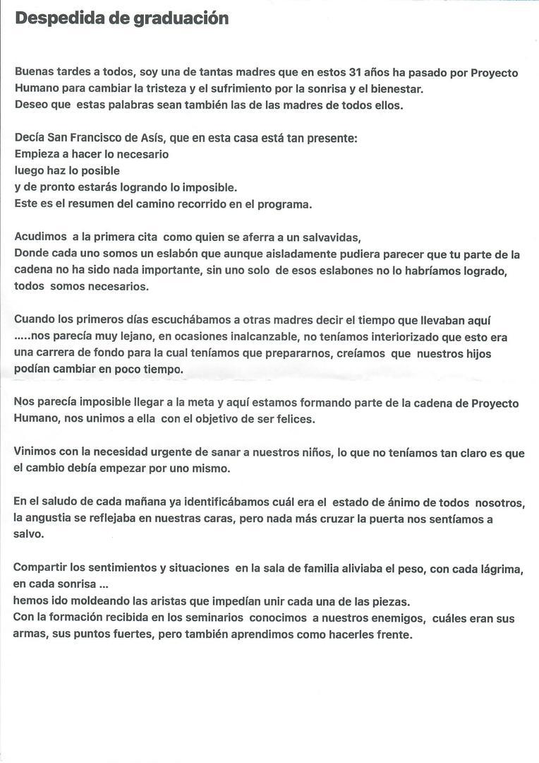 Mi labor como portavoz de todas las familias es la de expresar lo que ha supuesto para todos nosotros que estamos hoy aqui nuestro paso por Proyecto Humano, ya que no son sólo usuarios los que atravisan por este proceso, sino tambíén las familias.